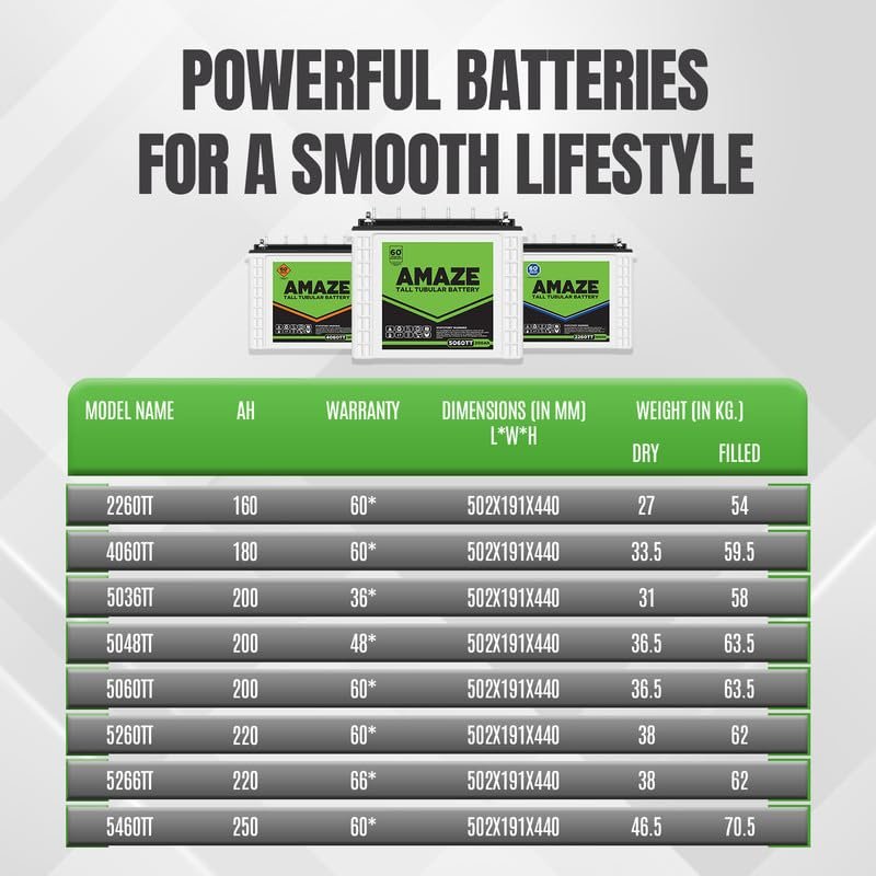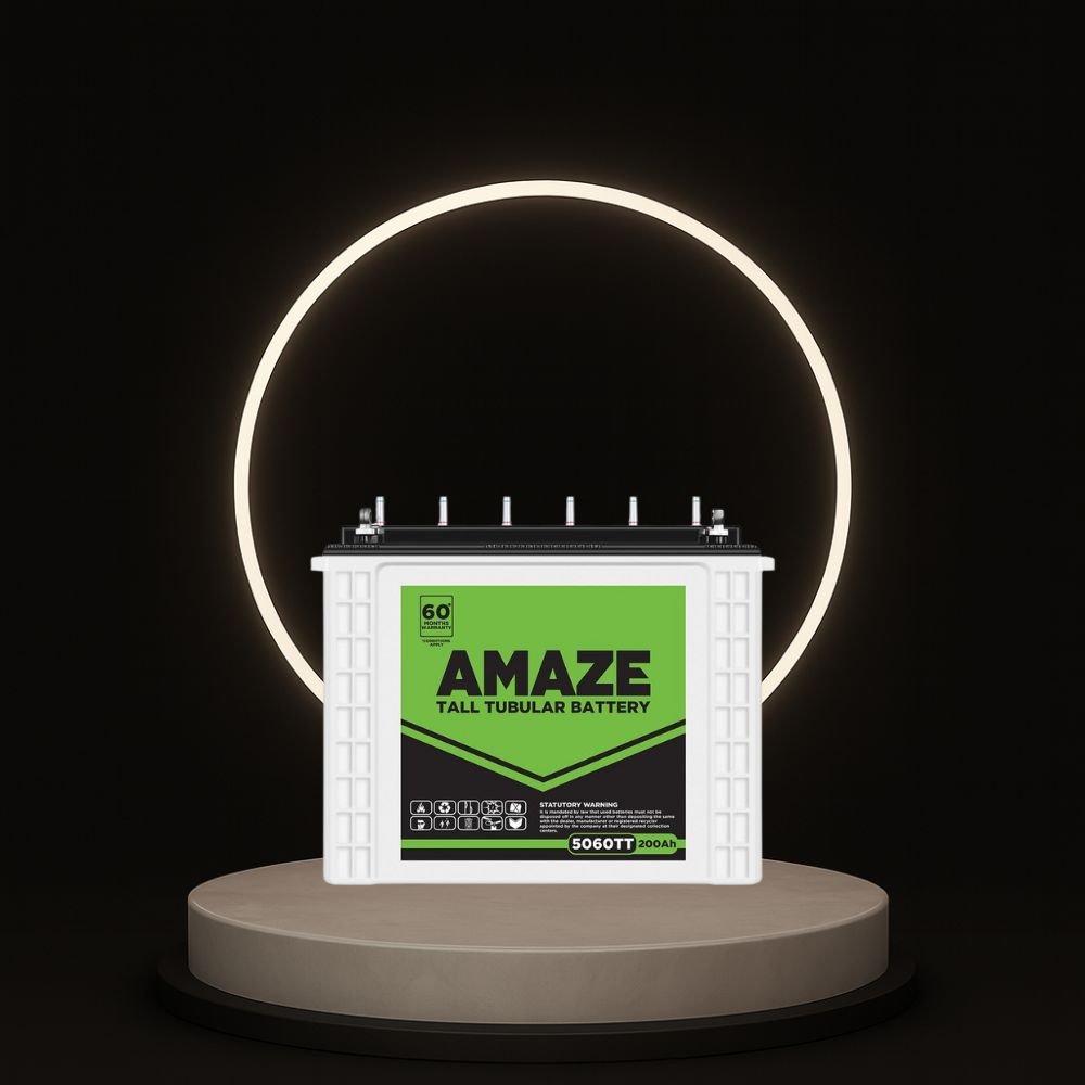 The Amaze 5060TT 200Ah Tall Tubular Battery is a powerful and dependable inverter battery designed for homes, offices, and shops. With its high 200Ah capacity and robust tall tubular construction, it delivers long backup duration, fast charging, and excellent performance in areas with frequent power cuts. Easy to install and built for durability, it requires minimal maintenance and comes with a 60-month warranty, ensuring reliable and worry-free power backup for years to come. The Amaze 5060TT 200Ah Tall Tubular Battery is a powerful and dependable inverter battery designed for homes, offices, and shops. With its high 200Ah capacity and robust tall tubular construction, it delivers long backup duration, fast charging, and excellent performance in areas with frequent power cuts. Easy to install and built for durability, it requires minimal maintenance and comes with a 60-month warranty, ensuring reliable and worry-free power backup for years to come.