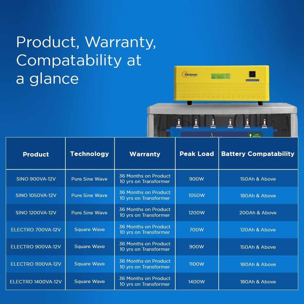 - Inverter Detail: Eastman Electro is Square Wave inverter; VA Rating: 700VA/12V | Peak Load :- 700W