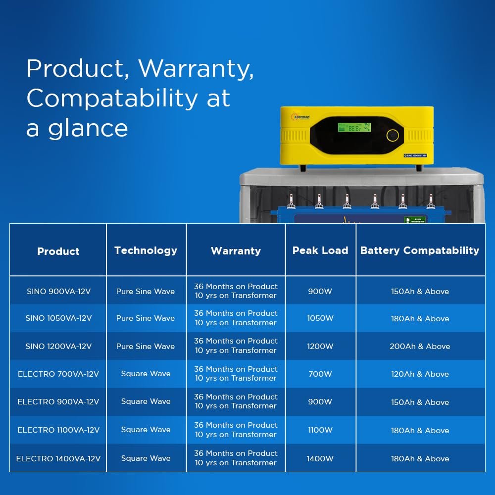 - Battery Compatibility: Compatible with 1 X (12V), 150AH & above battery. The UPS supports wide range of batteries like, flat plate, tubular, SMF (Battery to be purchased separately)