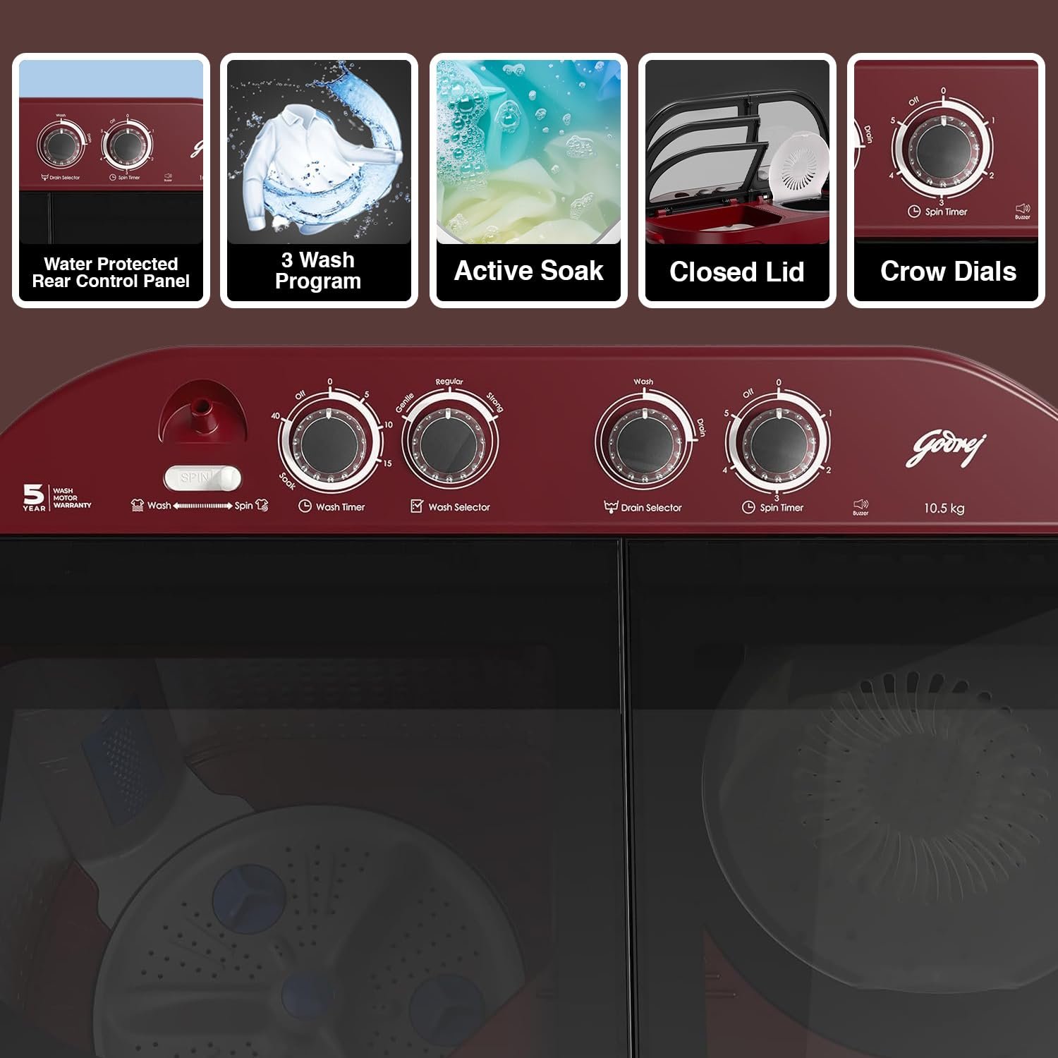 - Key Performance Features : 460W PowerMaxx Wash Motor | Ribbed Walls for Scrubbing Action | Crown Dials | 100% Rust-Proof inside out | Water Protected Rear Control Panel | Strong Wash Program | Tri Roto Scrub Pulsator | 5 Star Energy Rating