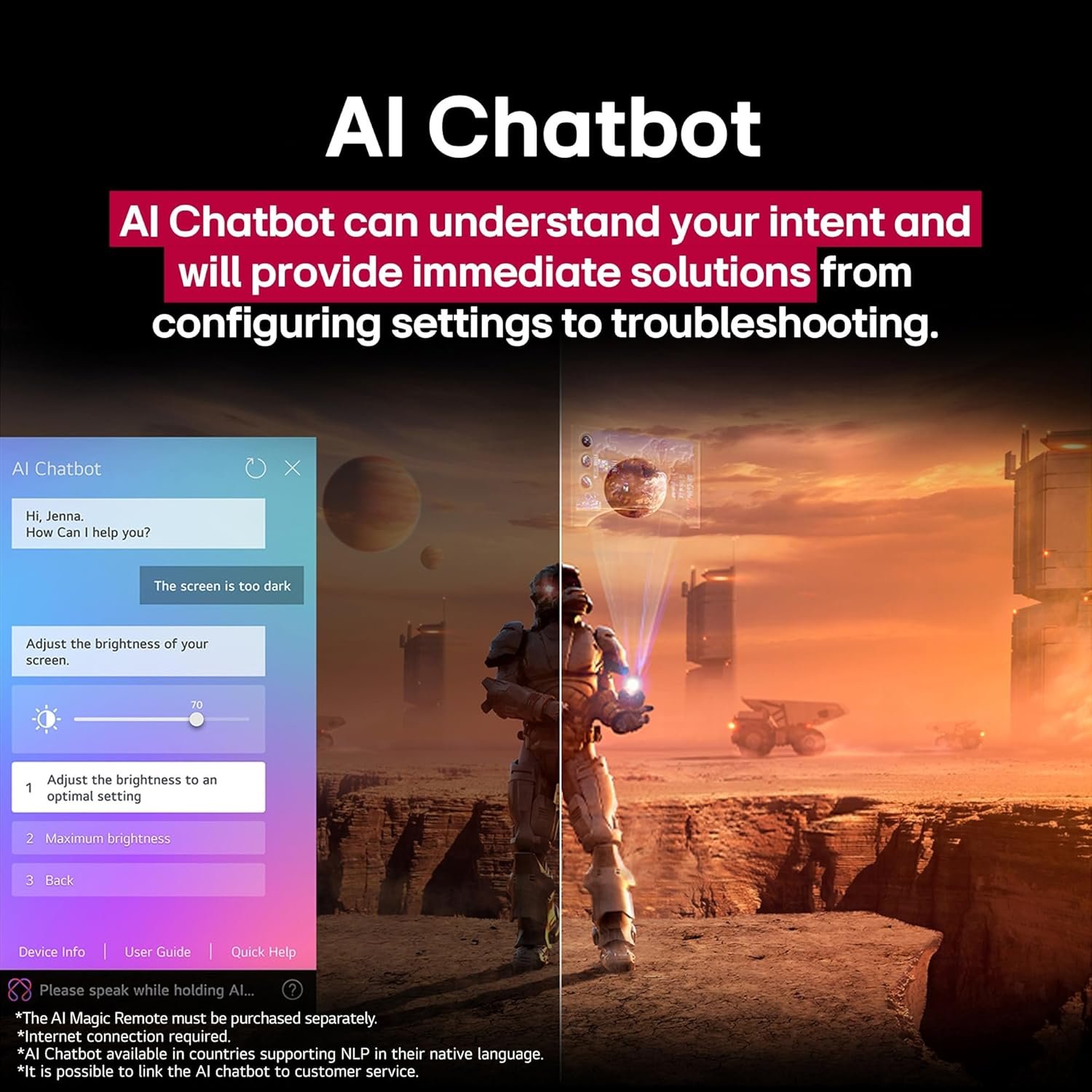 - Sound: 20 Watts Output | AI Sound Pro (Virtual 9.1.2 Up-mix) | Dolby Atmos | Clear Voice Pro (Auto Volume Leveling) | AI Acoustic Tuning | LG Sound Sync | Bluetooth Surround Ready (2 Way Playback) | WOW Orchestra| Down Firing Speakers