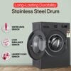 - Drum / Pulsator type & Body material: Fully Stainless Steel Drum built to bring convenience and durability, this stainless steel drum makes your washing machine last longer. Not just this, its stainless steel lifter keeps the insides of the washing machine hygienic | Body Material – Steel