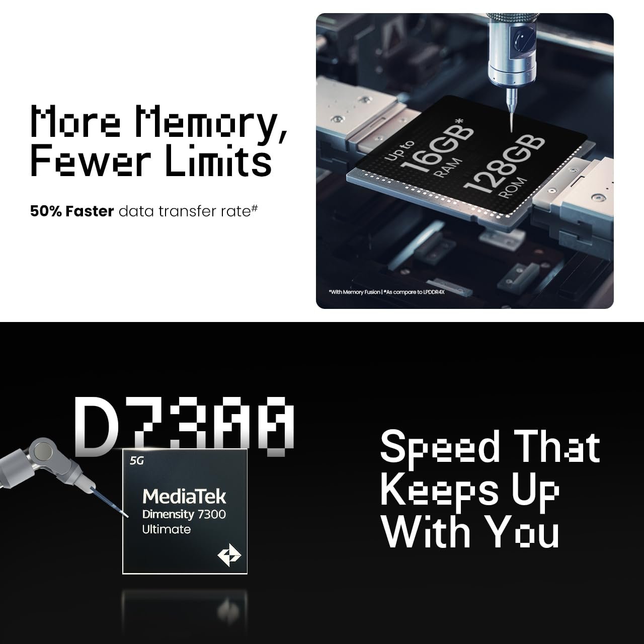 - Processor (D7300 Ultimate Processor + 16GB RAM* with 128GB ROM) : Engineered with the MediaTek D7300 Ultimate chipset and built on a 4nm process, it’s lean, mean, and lightning fast. Paired with 16GB RAM* (with memory fusion) and 128GB storage, multitasking feels smooth, apps load instantly, and gaming stays lag-free.