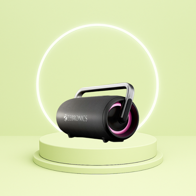 - [Portability]: The fabric-finished Zeb-Axon 100 portable BT speaker is the ultimate party choice that can be carried anywhere, including a carry handle.